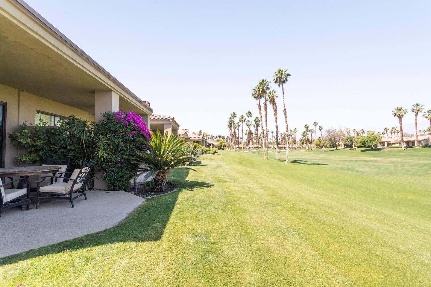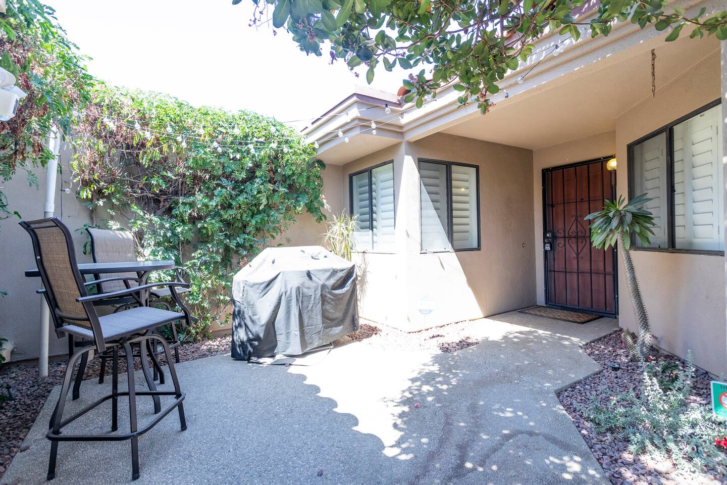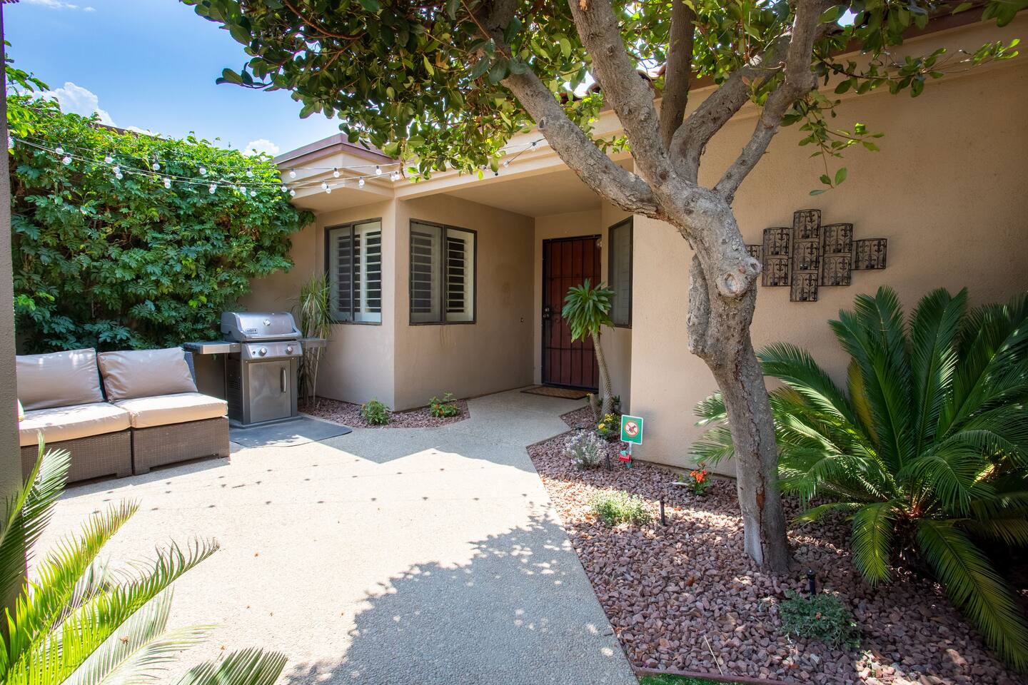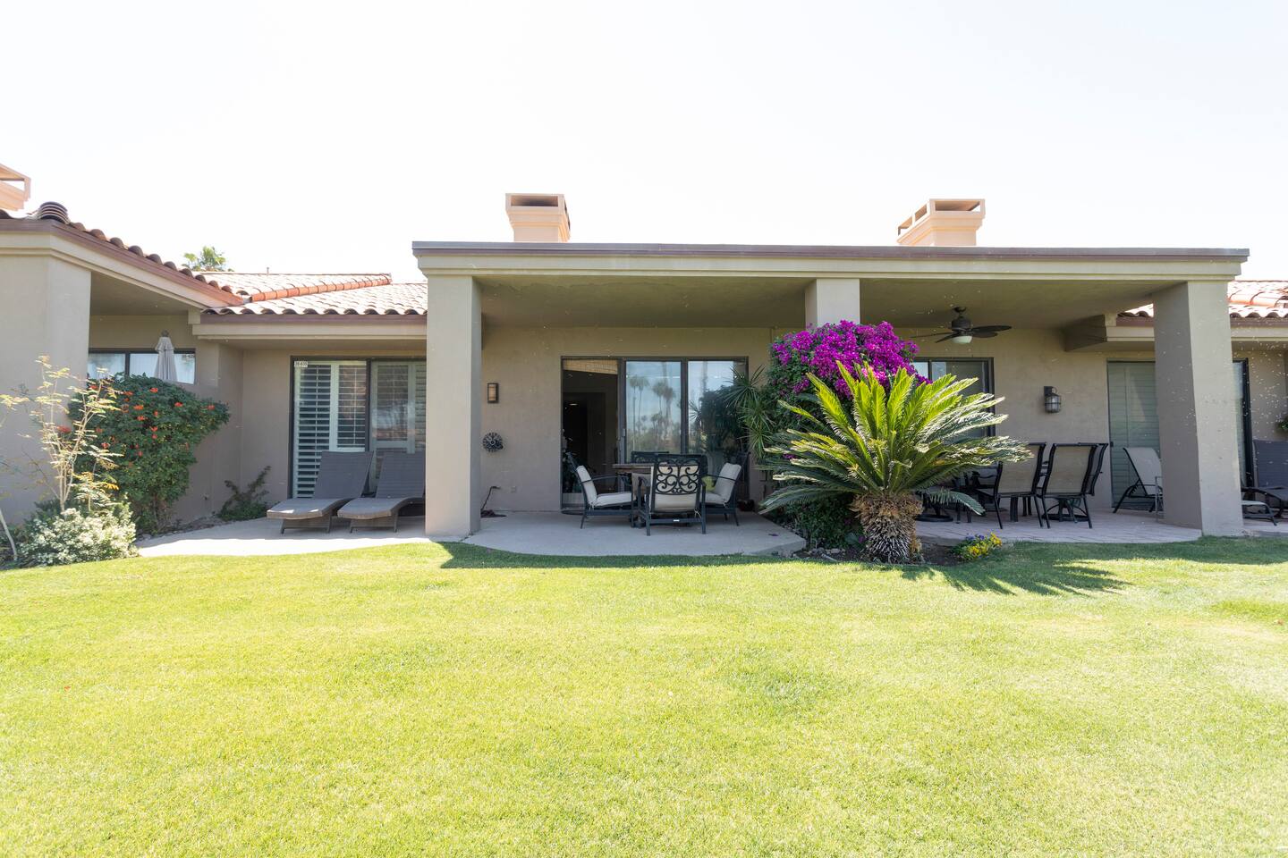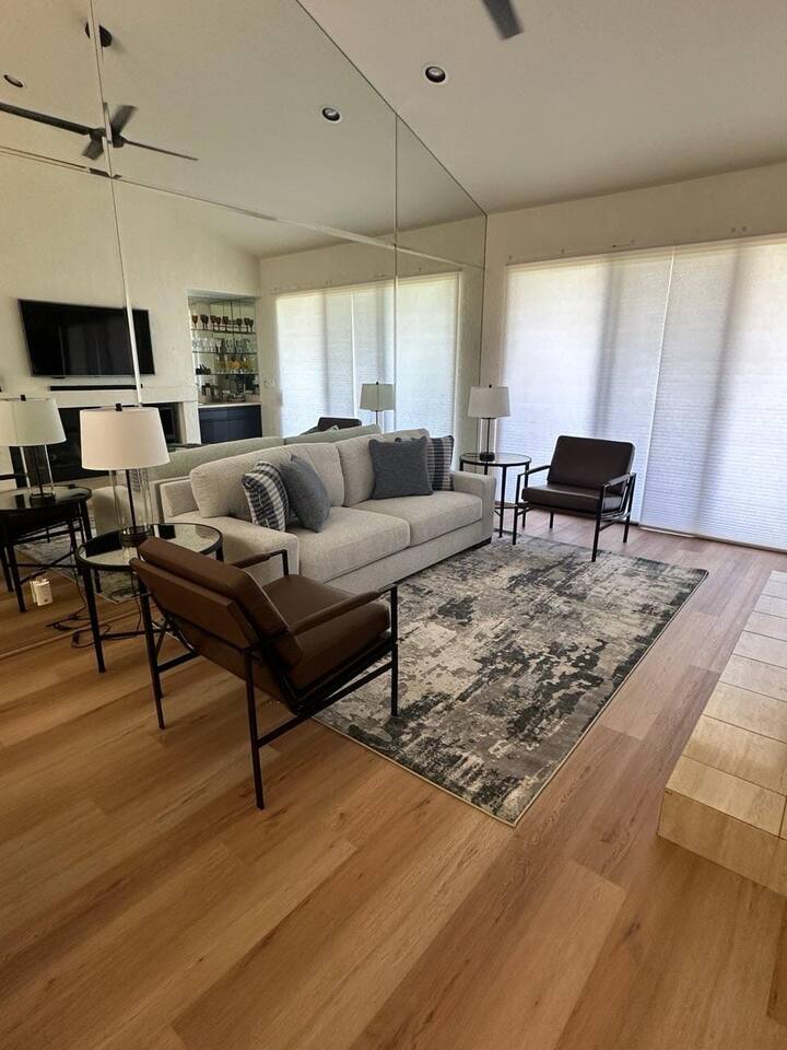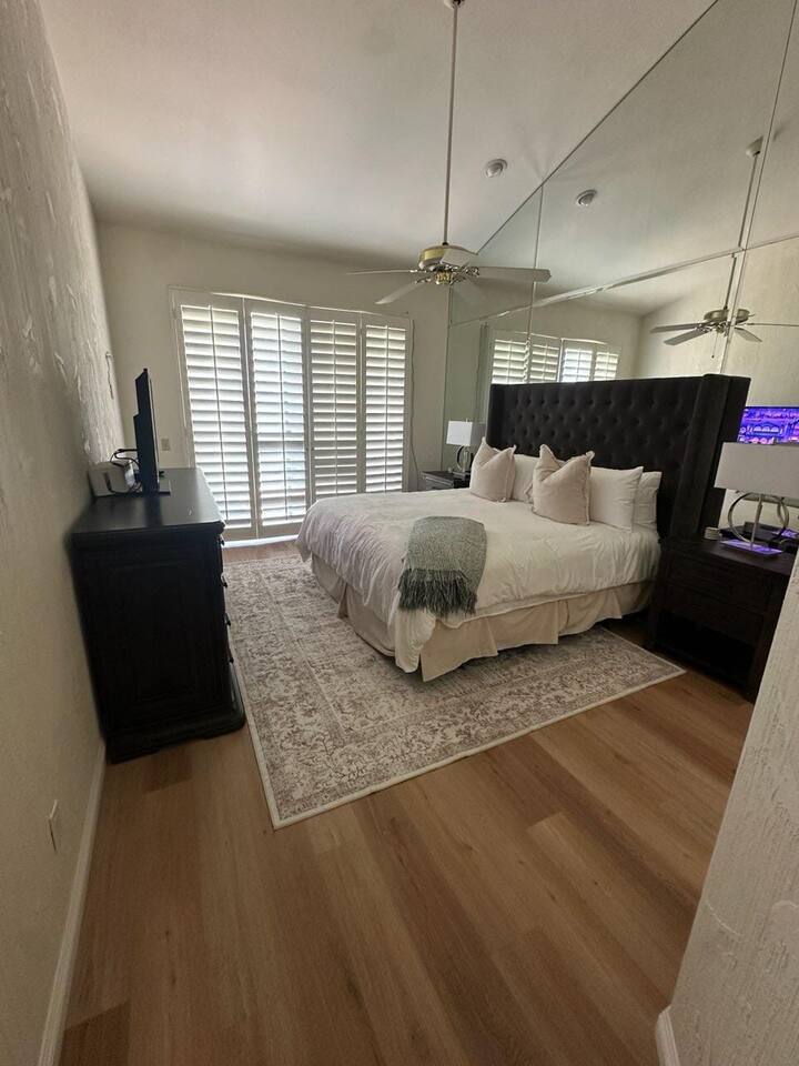The home is a single-story condo with a welcoming living and dining room concept. There are no upstairs or downstairs neighbors, and no stairs to access the home. There are 3 bedrooms and 3 bathrooms, and all the bedrooms feel private as they are all on separate ends of the home. The master bedroom faces the golf course and has a sliding glass door that leads you out to the backyard with a stunning view. There is a king-size bed and an ensuite bathroom attached. There is a bathtub and a shower, dual vanity sinks, and a vanity station. The second bedroom is close to the front door of the home and has a queen-size bed and an ensuite bathroom attached. There is a bathtub and a shower, a sink, and a vanity station. The third bedroom is close to the front door and just across the hall from the second bedroom and has a queen-size bed and a shared jack-n-jill bathroom attached. There is a standing shower, sink, and a first aid kit, and miscellaneous supplies available in the armoire if needed. This bathroom can be accessed from the hallway with other guests. The master bedroom, second bedroom and living room have TV's. All have Roku/ Smart TV and only the living room has cable. The newly updated kitchen looks out at the dining room and the view of the beautiful golf course. The living room has an open floor plan where you can enjoy the comfy couches and watch a movie on the 62-inch television. There is a Bose soundbar below the television where you can hook up your smart device to it and enjoy some music, just be mindful of the noise and of the neighbors whenever playing music. Music is not allowed to be played outdoors at any time as hefty fines can be assessed. The bookshelf has books for you to enjoy. The dining room table can seat 4 guests comfortably, and there is a small private dining table in the kitchen area as well. There is a bar in the living room that faces the backyard There is a gas BBQ near the entrance of the home in a private courtyard as well as outdoor seating. There is a sliding glass door from the living room as well as the master bedroom that leads you to the backyard that faces the golf course. There are 2 outdoor lounge chairs as well as a table with 2 chairs for you to be able to enjoy the view. There is a nearby pool and spa that’s within walking distance from the front door. The complex has other pools in it as well that can be accessed. There are a few pool areas that require a key for entry. The home temperature is controlled by a Nest that only the owner can access. Please message the host if you need the temperature changed for any reason.