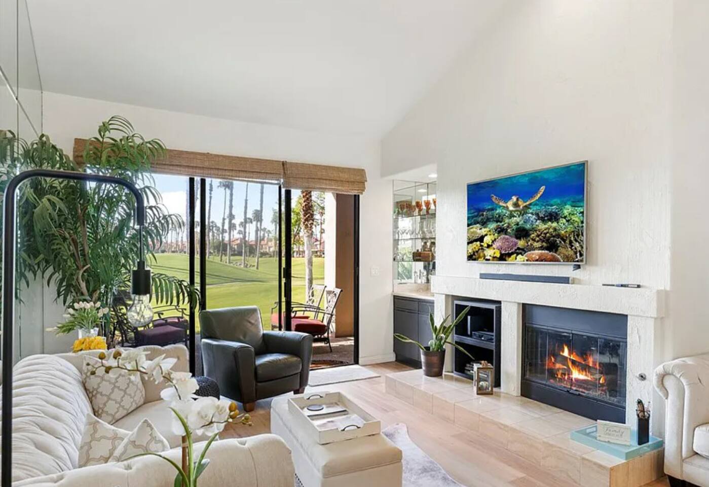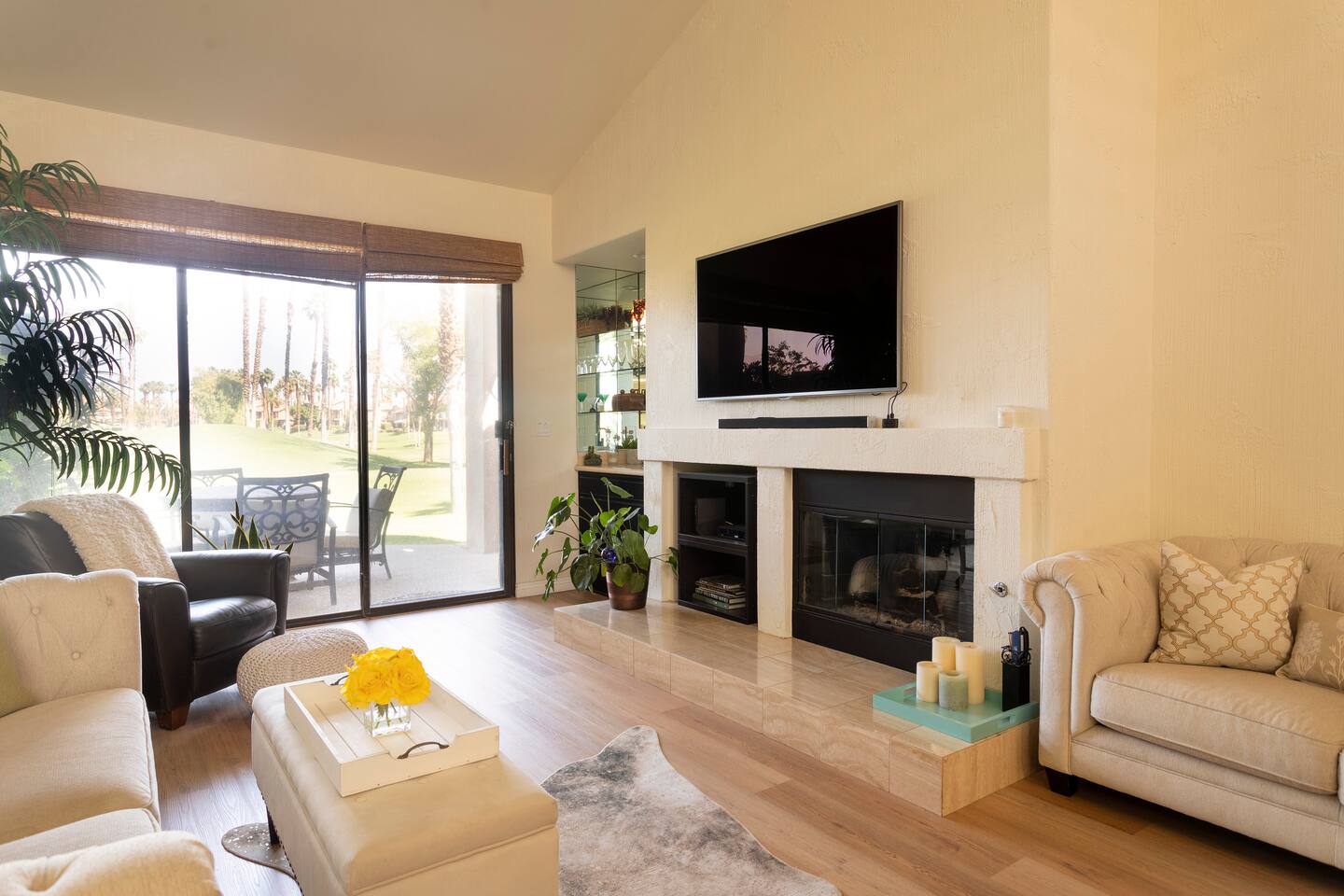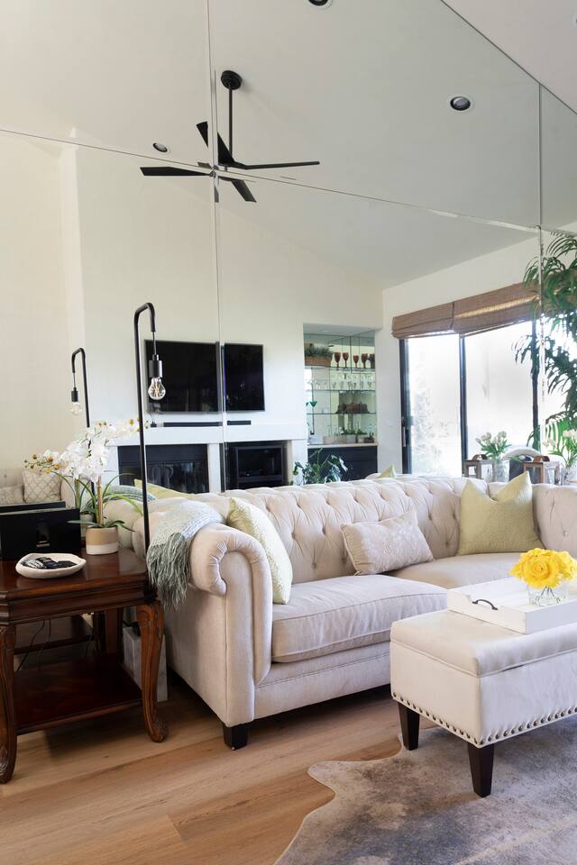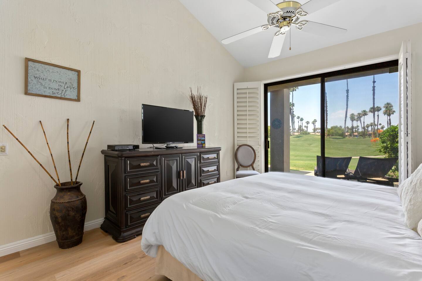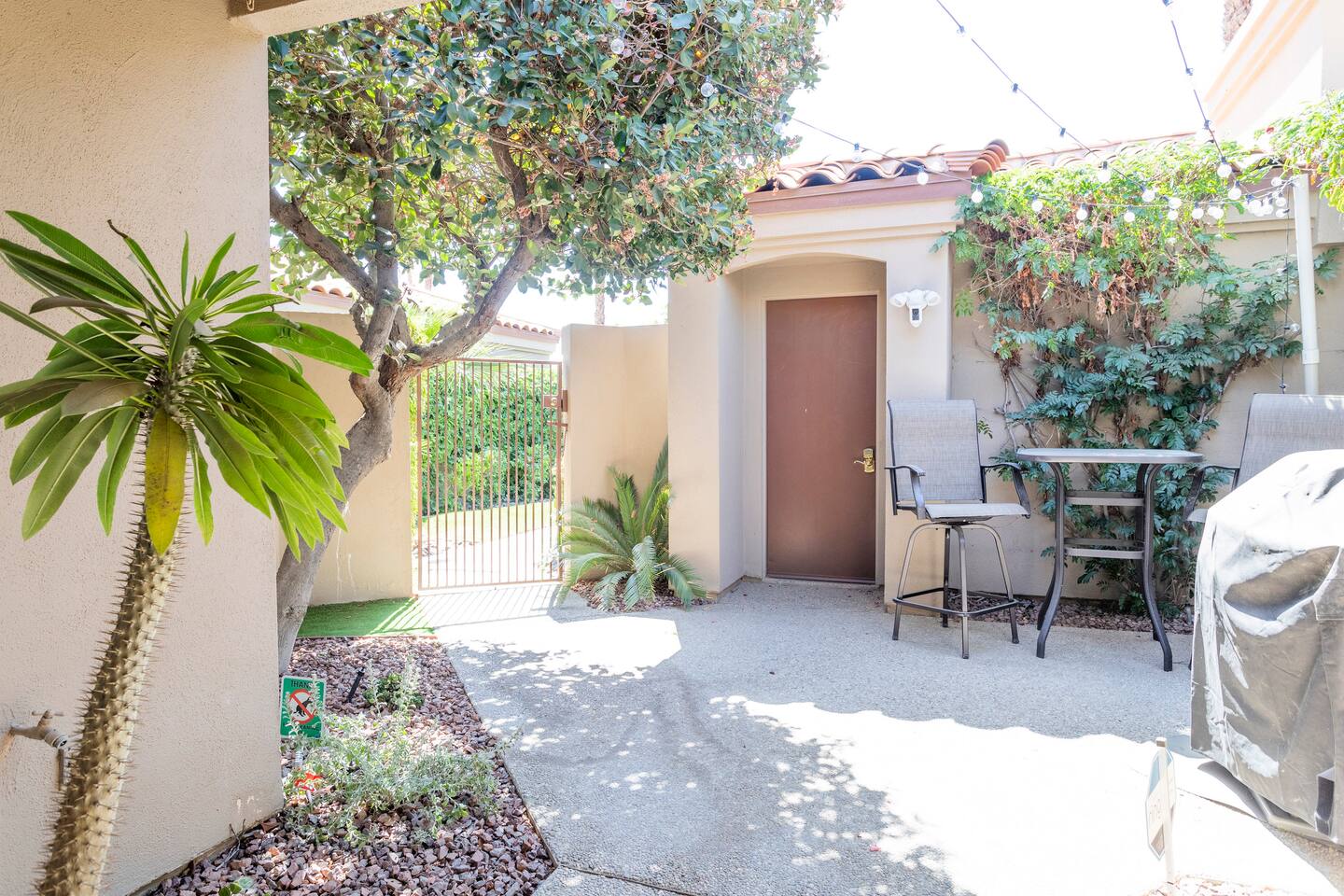 The home is a single-story condo with a welcoming living and dining room concept. There are no upstairs or downstairs neighbors, and no stairs to access the home. There are 3 bedrooms and 3 bathrooms, and all the bedrooms feel private as they are all on separate ends of the home. The master bedroom faces the golf course and has a sliding glass door that leads you out to the backyard with a stunning view. There is a king-size bed and an ensuite bathroom attached. There is a bathtub and a shower, dual vanity sinks, and a vanity station. The second bedroom is close to the front door of the home and has a queen-size bed and an ensuite bathroom attached. There is a bathtub and a shower, a sink, and a vanity station. The third bedroom is close to the front door and just across the hall from the second bedroom and has a queen-size bed and a shared jack-n-jill bathroom attached. There is a standing shower, sink, and a first aid kit, and miscellaneous supplies available in the armoire if needed. This bathroom can be accessed from the hallway with other guests. The master bedroom, second bedroom and living room have TV's. All have Roku/ Smart TV and only the living room has cable. The newly updated kitchen looks out at the dining room and the view of the beautiful golf course. The living room has an open floor plan where you can enjoy the comfy couches and watch a movie on the 62-inch television. There is a Bose soundbar below the television where you can hook up your smart device to it and enjoy some music, just be mindful of the noise and of the neighbors whenever playing music. Music is not allowed to be played outdoors at any time as hefty fines can be assessed. The bookshelf has books for you to enjoy. The dining room table can seat 4 guests comfortably, and there is a small private dining table in the kitchen area as well. There is a bar in the living room that faces the backyard There is a gas BBQ near the entrance of the home in a private courtyard as well as outdoor seating. There is a sliding glass door from the living room as well as the master bedroom that leads you to the backyard that faces the golf course. There are 2 outdoor lounge chairs as well as a table with 2 chairs for you to be able to enjoy the view. There is a nearby pool and spa that’s within walking distance from the front door. The complex has other pools in it as well that can be accessed. There are a few pool areas that require a key for entry. The home temperature is controlled by a Nest that only the owner can access. Please message the host if you need the temperature changed for any reason.