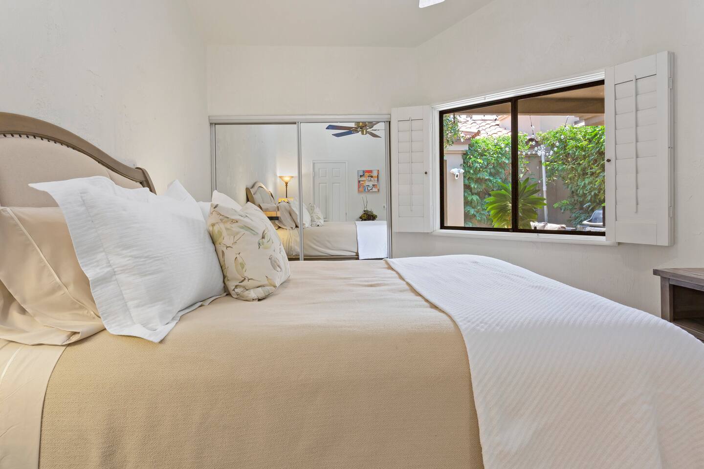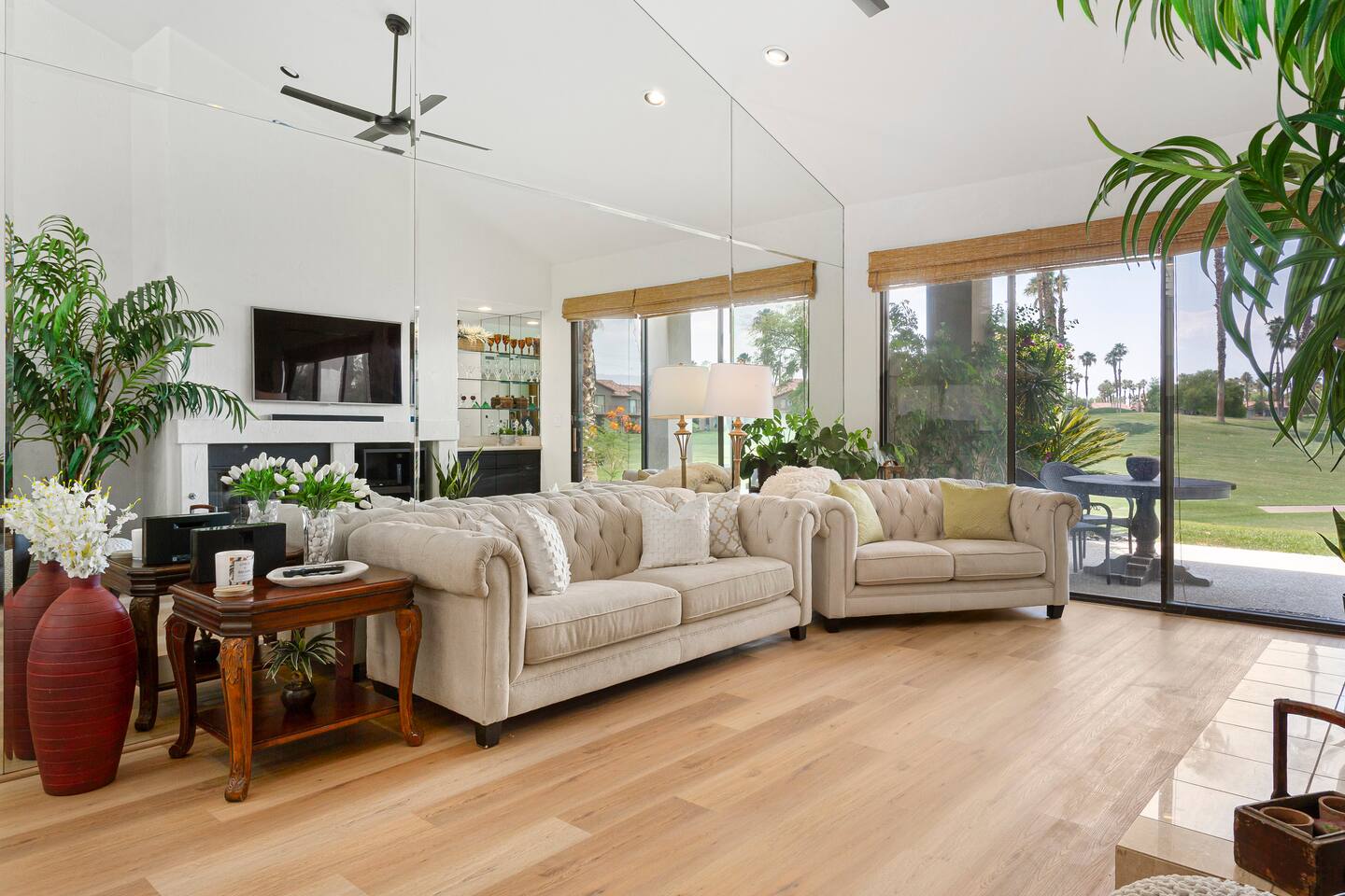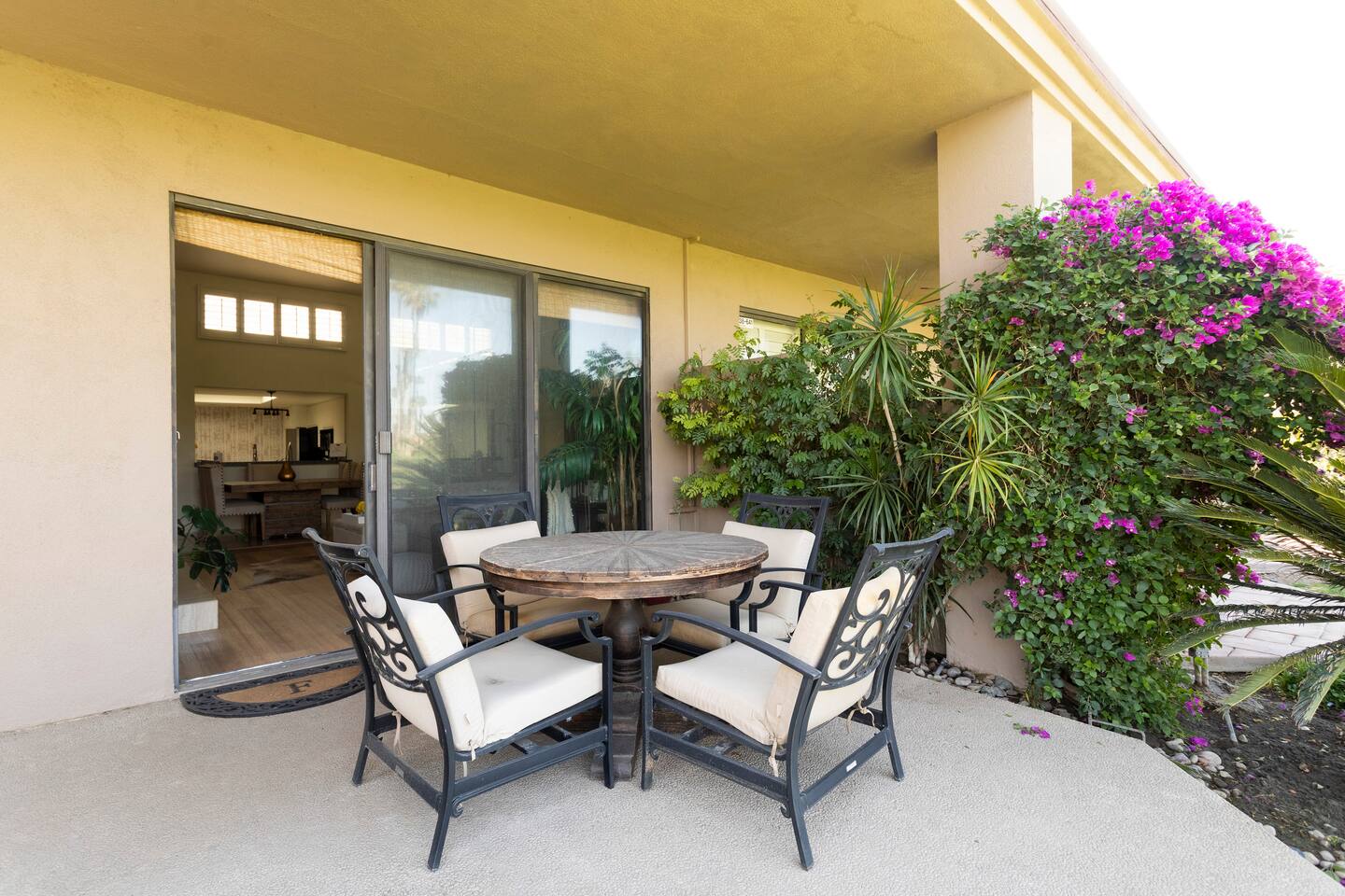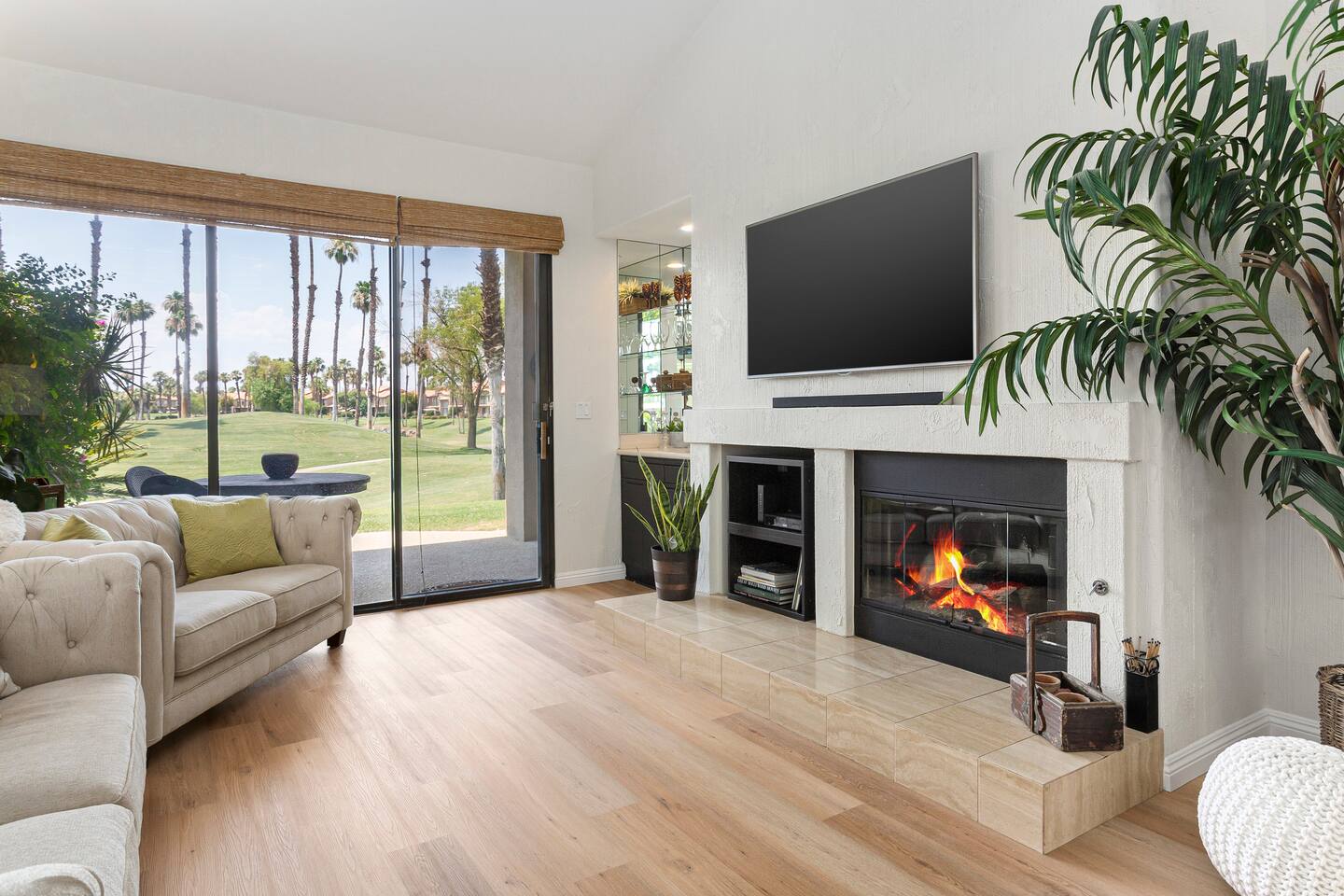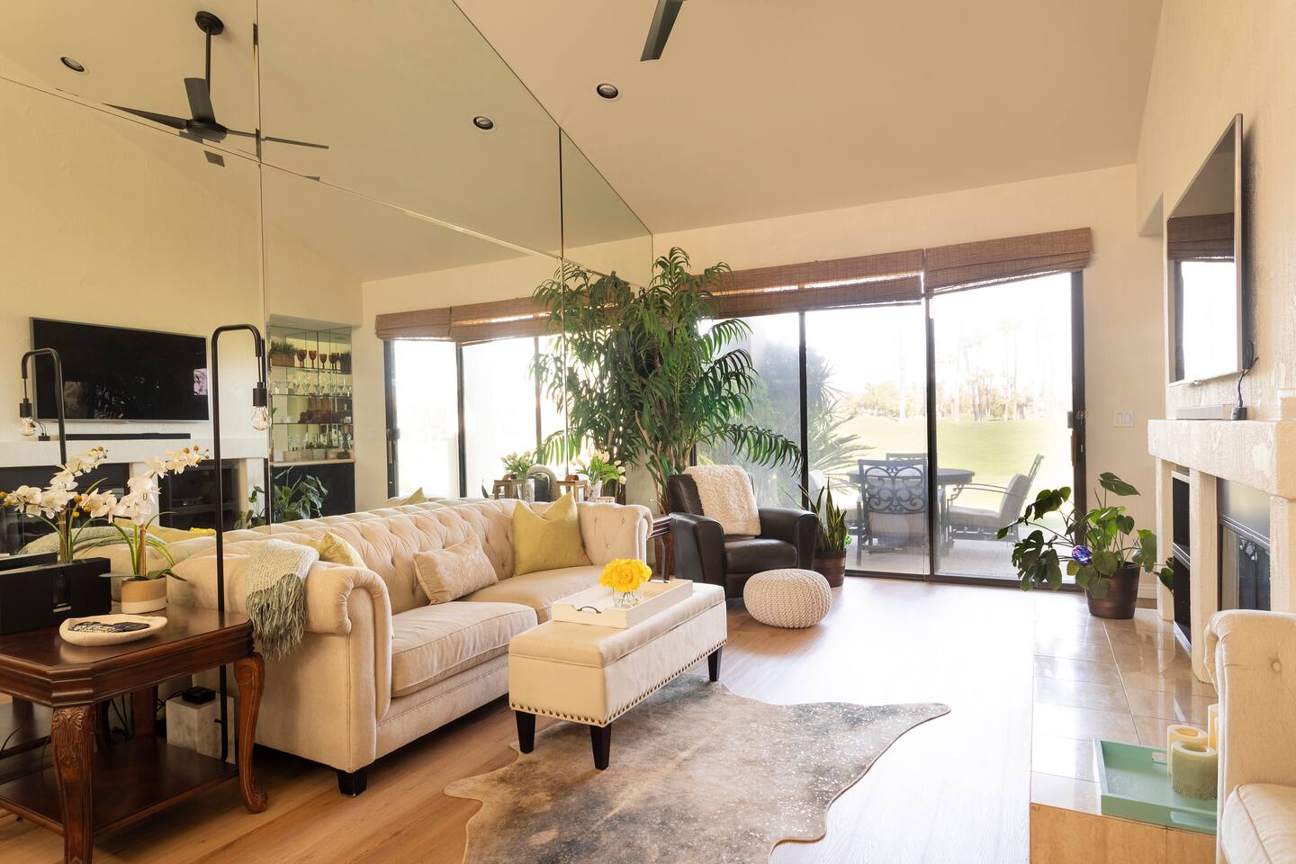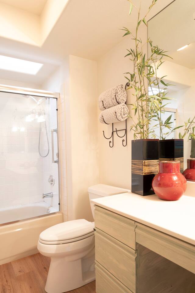The home is a single-story condo with a welcoming living and dining room concept. There are no upstairs or downstairs neighbors, and no stairs to access the home. There are 3 bedrooms and 3 bathrooms, and all the bedrooms feel private as they are all on separate ends of the home. The master bedroom faces the golf course and has a sliding glass door that leads you out to the backyard with a stunning view. There is a king-size bed and an ensuite bathroom attached. There is a bathtub and a shower, dual vanity sinks, and a vanity station. The second bedroom is close to the front door of the home and has a queen-size bed and an ensuite bathroom attached. There is a bathtub and a shower, a sink, and a vanity station. The third bedroom is close to the front door and just across the hall from the second bedroom and has a queen-size bed and a shared jack-n-jill bathroom attached. There is a standing shower, sink, and a first aid kit, and miscellaneous supplies available in the armoire if needed. This bathroom can be accessed from the hallway with other guests. The master bedroom, second bedroom and living room have TV's. All have Roku/ Smart TV and only the living room has cable. The newly updated kitchen looks out at the dining room and the view of the beautiful golf course. The living room has an open floor plan where you can enjoy the comfy couches and watch a movie on the 62-inch television. There is a Bose soundbar below the television where you can hook up your smart device to it and enjoy some music, just be mindful of the noise and of the neighbors whenever playing music. Music is not allowed to be played outdoors at any time as hefty fines can be assessed. The bookshelf has books for you to enjoy. The dining room table can seat 4 guests comfortably, and there is a small private dining table in the kitchen area as well. There is a bar in the living room that faces the backyard There is a gas BBQ near the entrance of the home in a private courtyard as well as outdoor seating. There is a sliding glass door from the living room as well as the master bedroom that leads you to the backyard that faces the golf course. There are 2 outdoor lounge chairs as well as a table with 2 chairs for you to be able to enjoy the view. There is a nearby pool and spa that’s within walking distance from the front door. The complex has other pools in it as well that can be accessed. There are a few pool areas that require a key for entry. The home temperature is controlled by a Nest that only the owner can access. Please message the host if you need the temperature changed for any reason.