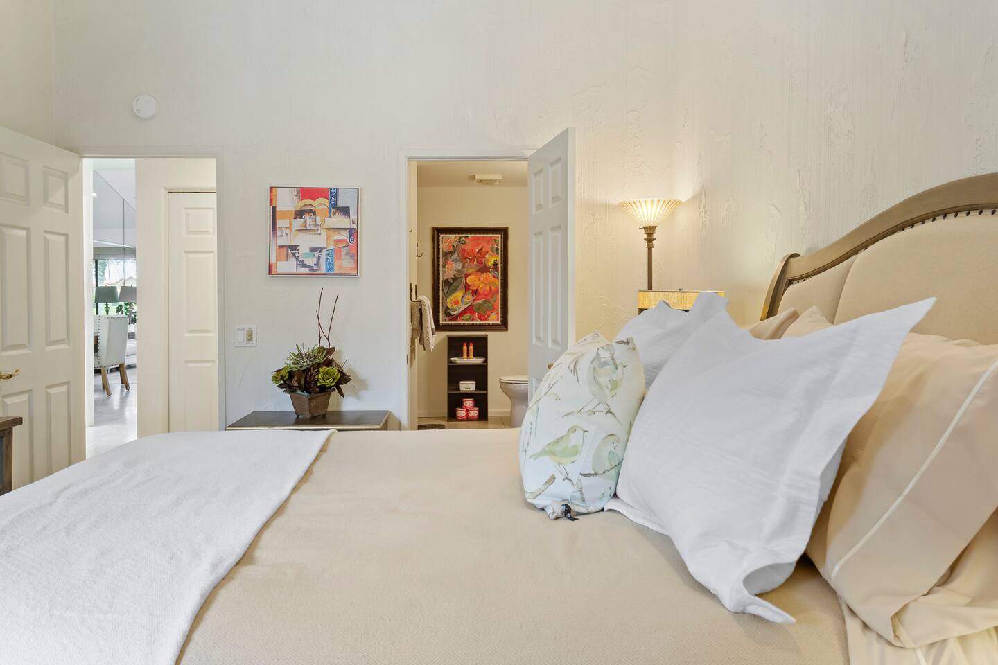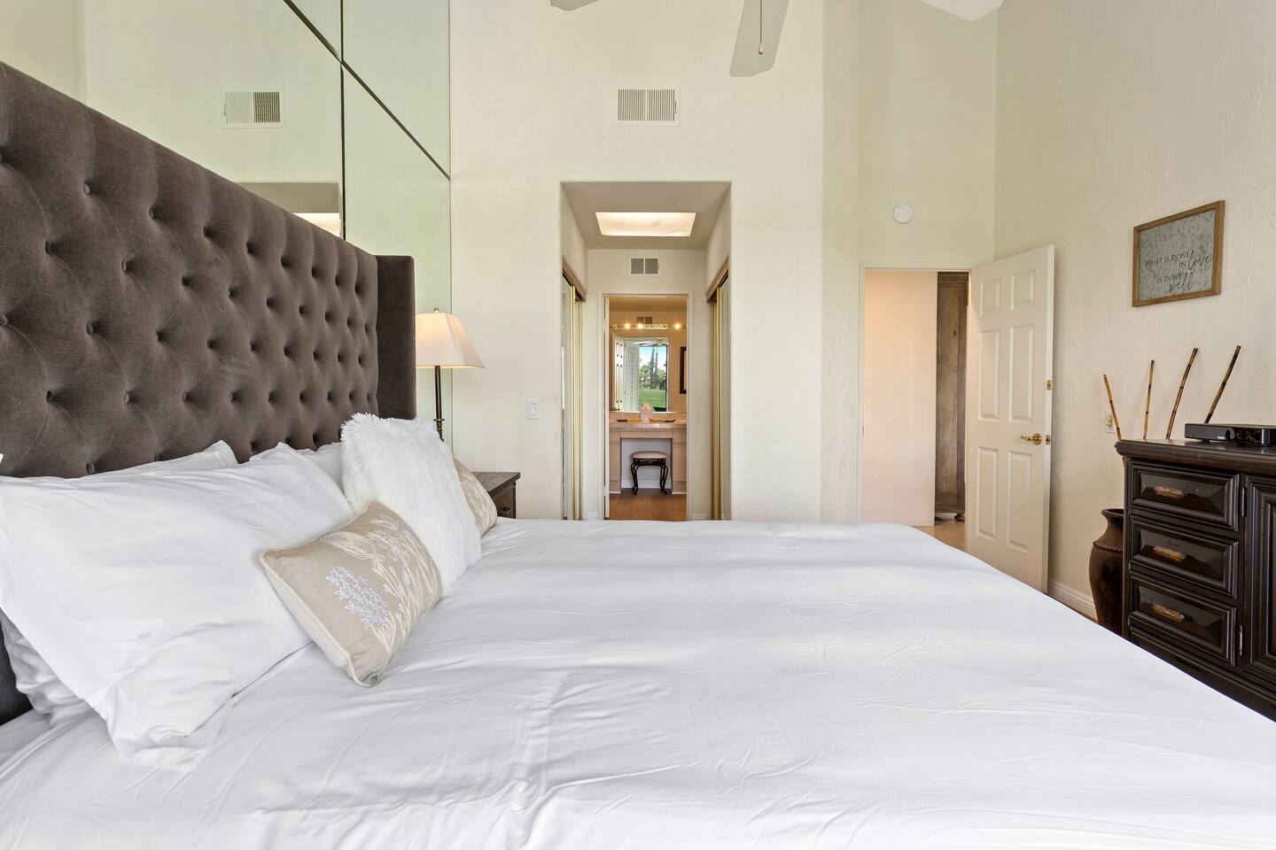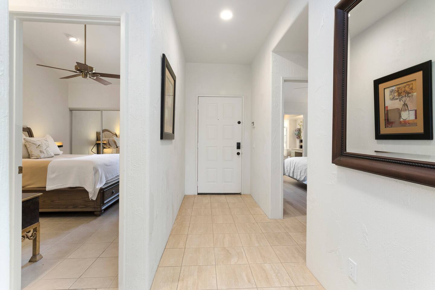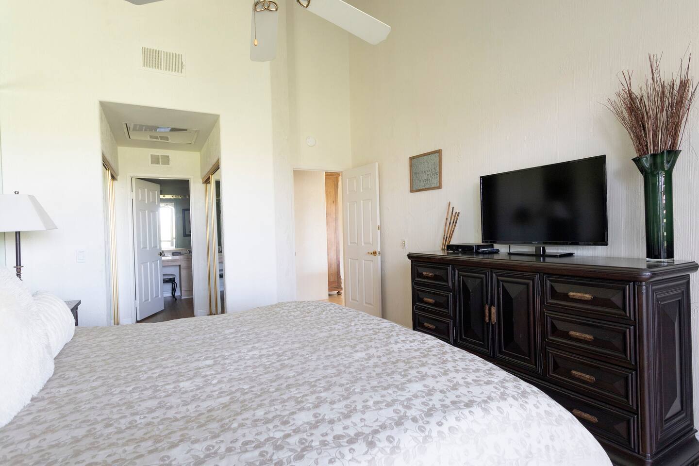 The home is a single-story condo with a welcoming living and dining room concept. There are no upstairs or downstairs neighbors, and no stairs to access the home. There are 3 bedrooms and 3 bathrooms, and all the bedrooms feel private as they are all on separate ends of the home. The master bedroom faces the golf course and has a sliding glass door that leads you out to the backyard with a stunning view. There is a king-size bed and an ensuite bathroom attached. There is a bathtub and a shower, dual vanity sinks, and a vanity station. The second bedroom is close to the front door of the home and has a queen-size bed and an ensuite bathroom attached. There is a bathtub and a shower, a sink, and a vanity station. The third bedroom is close to the front door and just across the hall from the second bedroom and has a queen-size bed and a shared jack-n-jill bathroom attached. There is a standing shower, sink, and a first aid kit, and miscellaneous supplies available in the armoire if needed. This bathroom can be accessed from the hallway with other guests. The master bedroom, second bedroom and living room have TV's. All have Roku/ Smart TV and only the living room has cable. The newly updated kitchen looks out at the dining room and the view of the beautiful golf course. The living room has an open floor plan where you can enjoy the comfy couches and watch a movie on the 62-inch television. There is a Bose soundbar below the television where you can hook up your smart device to it and enjoy some music, just be mindful of the noise and of the neighbors whenever playing music. Music is not allowed to be played outdoors at any time as hefty fines can be assessed. The bookshelf has books for you to enjoy. The dining room table can seat 4 guests comfortably, and there is a small private dining table in the kitchen area as well. There is a bar in the living room that faces the backyard There is a gas BBQ near the entrance of the home in a private courtyard as well as outdoor seating. There is a sliding glass door from the living room as well as the master bedroom that leads you to the backyard that faces the golf course. There are 2 outdoor lounge chairs as well as a table with 2 chairs for you to be able to enjoy the view. There is a nearby pool and spa that’s within walking distance from the front door. The complex has other pools in it as well that can be accessed. There are a few pool areas that require a key for entry. The home temperature is controlled by a Nest that only the owner can access. Please message the host if you need the temperature changed for any reason.
