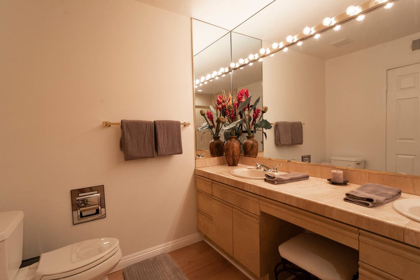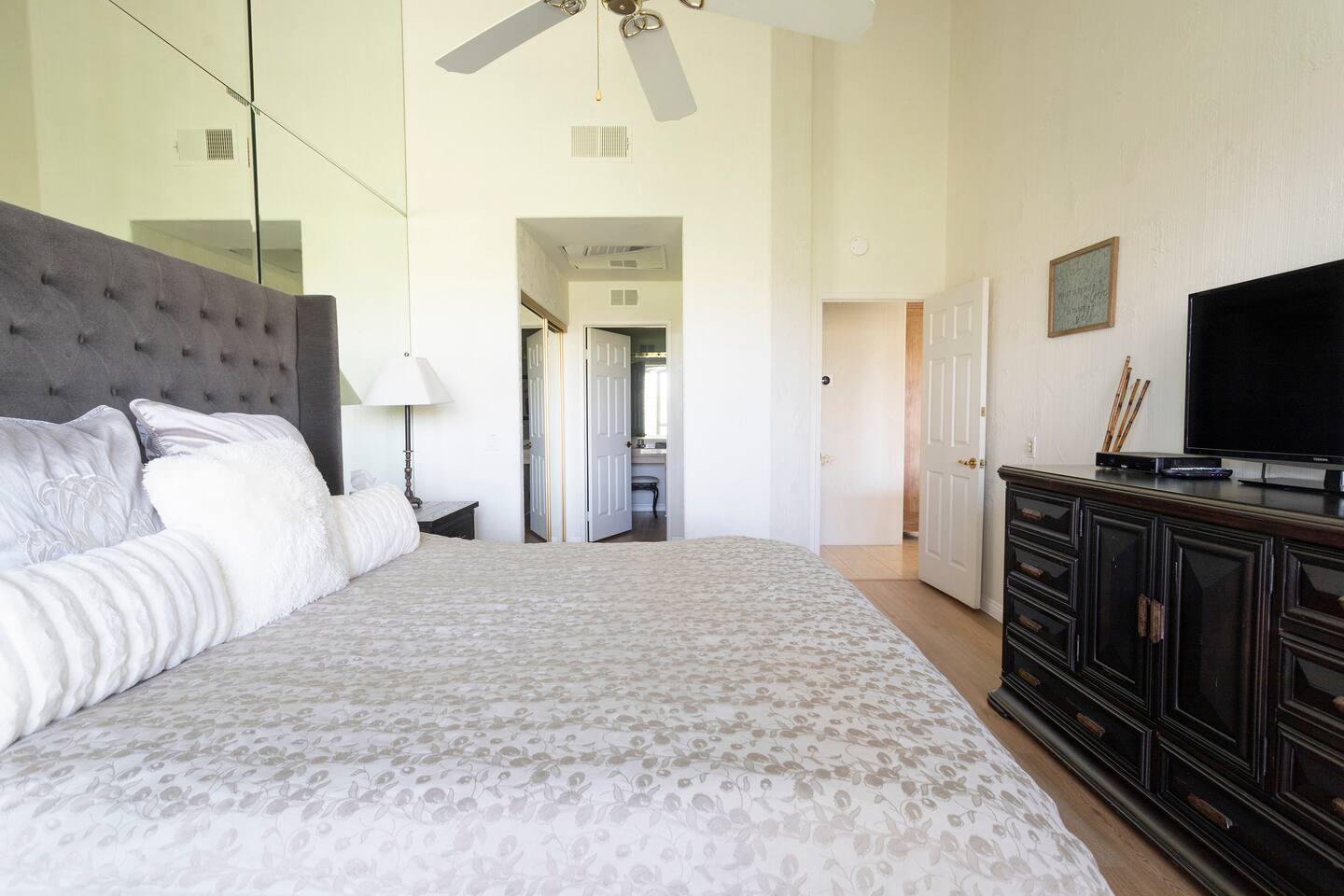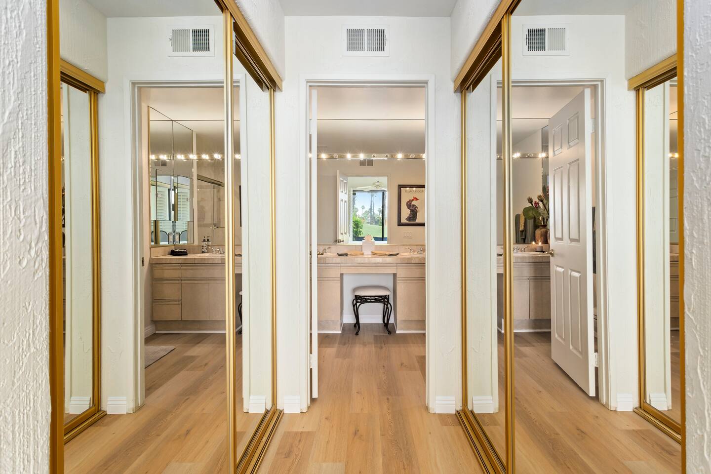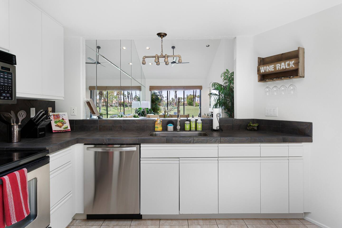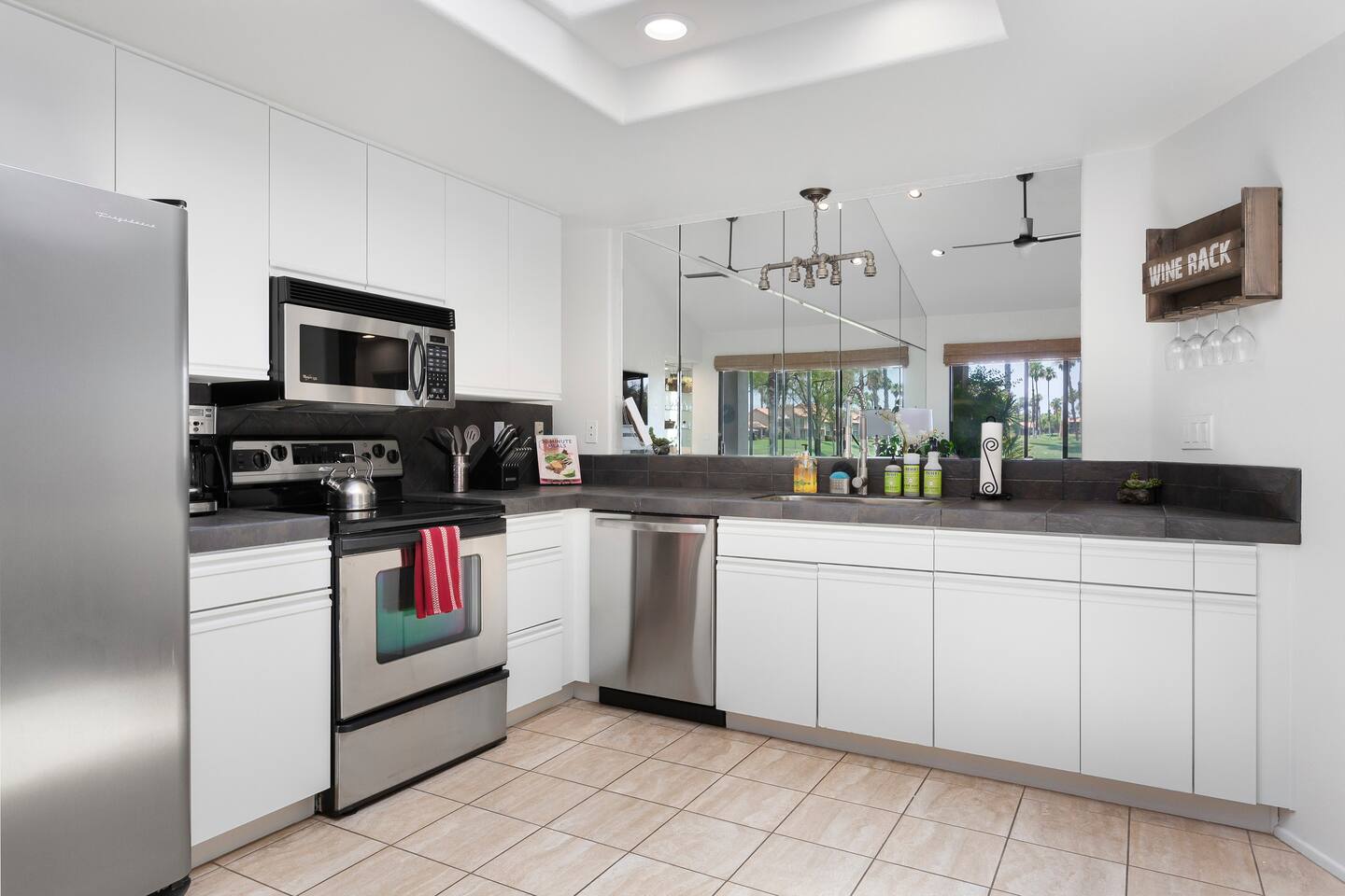 The home is a single-story condo with a welcoming living and dining room concept. There are no upstairs or downstairs neighbors, and no stairs to access the home. There are 3 bedrooms and 3 bathrooms, and all the bedrooms feel private as they are all on separate ends of the home. The master bedroom faces the golf course and has a sliding glass door that leads you out to the backyard with a stunning view. There is a king-size bed and an ensuite bathroom attached. There is a bathtub and a shower, dual vanity sinks, and a vanity station. The second bedroom is close to the front door of the home and has a queen-size bed and an ensuite bathroom attached. There is a bathtub and a shower, a sink, and a vanity station. The third bedroom is close to the front door and just across the hall from the second bedroom and has a queen-size bed and a shared jack-n-jill bathroom attached. There is a standing shower, sink, and a first aid kit, and miscellaneous supplies available in the armoire if needed. This bathroom can be accessed from the hallway with other guests. The master bedroom, second bedroom and living room have TV's. All have Roku/ Smart TV and only the living room has cable. The newly updated kitchen looks out at the dining room and the view of the beautiful golf course. The living room has an open floor plan where you can enjoy the comfy couches and watch a movie on the 62-inch television. There is a Bose soundbar below the television where you can hook up your smart device to it and enjoy some music, just be mindful of the noise and of the neighbors whenever playing music. Music is not allowed to be played outdoors at any time as hefty fines can be assessed. The bookshelf has books for you to enjoy. The dining room table can seat 4 guests comfortably, and there is a small private dining table in the kitchen area as well. There is a bar in the living room that faces the backyard There is a gas BBQ near the entrance of the home in a private courtyard as well as outdoor seating. There is a sliding glass door from the living room as well as the master bedroom that leads you to the backyard that faces the golf course. There are 2 outdoor lounge chairs as well as a table with 2 chairs for you to be able to enjoy the view. There is a nearby pool and spa that’s within walking distance from the front door. The complex has other pools in it as well that can be accessed. There are a few pool areas that require a key for entry. The home temperature is controlled by a Nest that only the owner can access. Please message the host if you need the temperature changed for any reason.