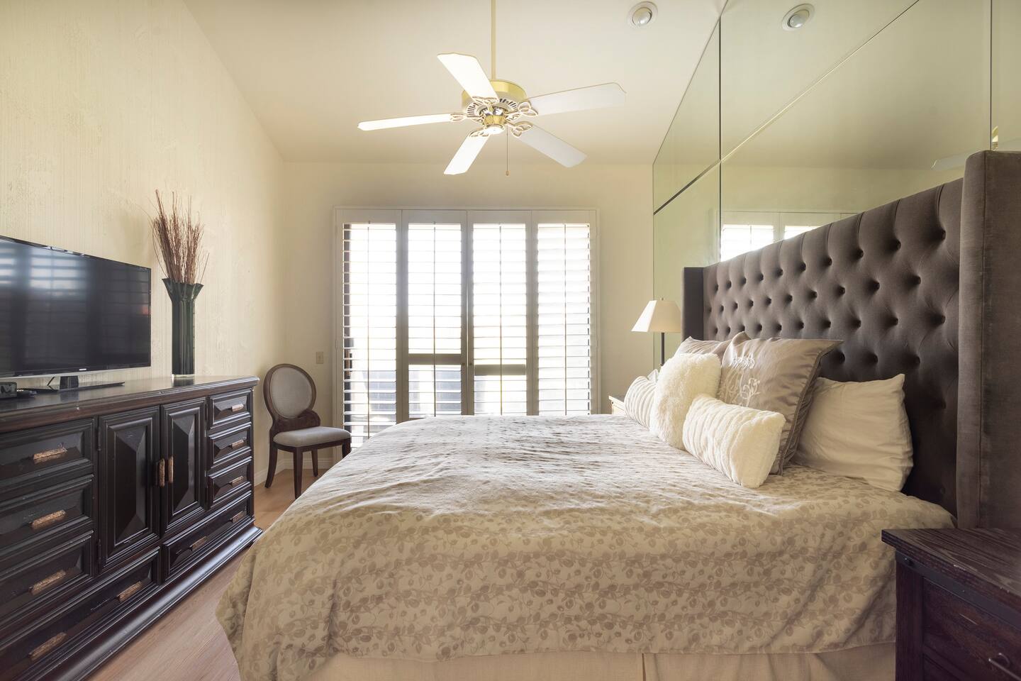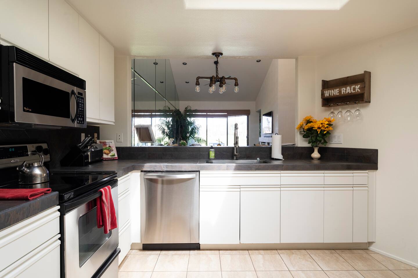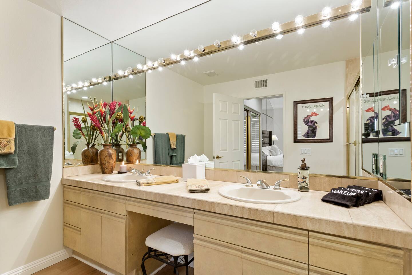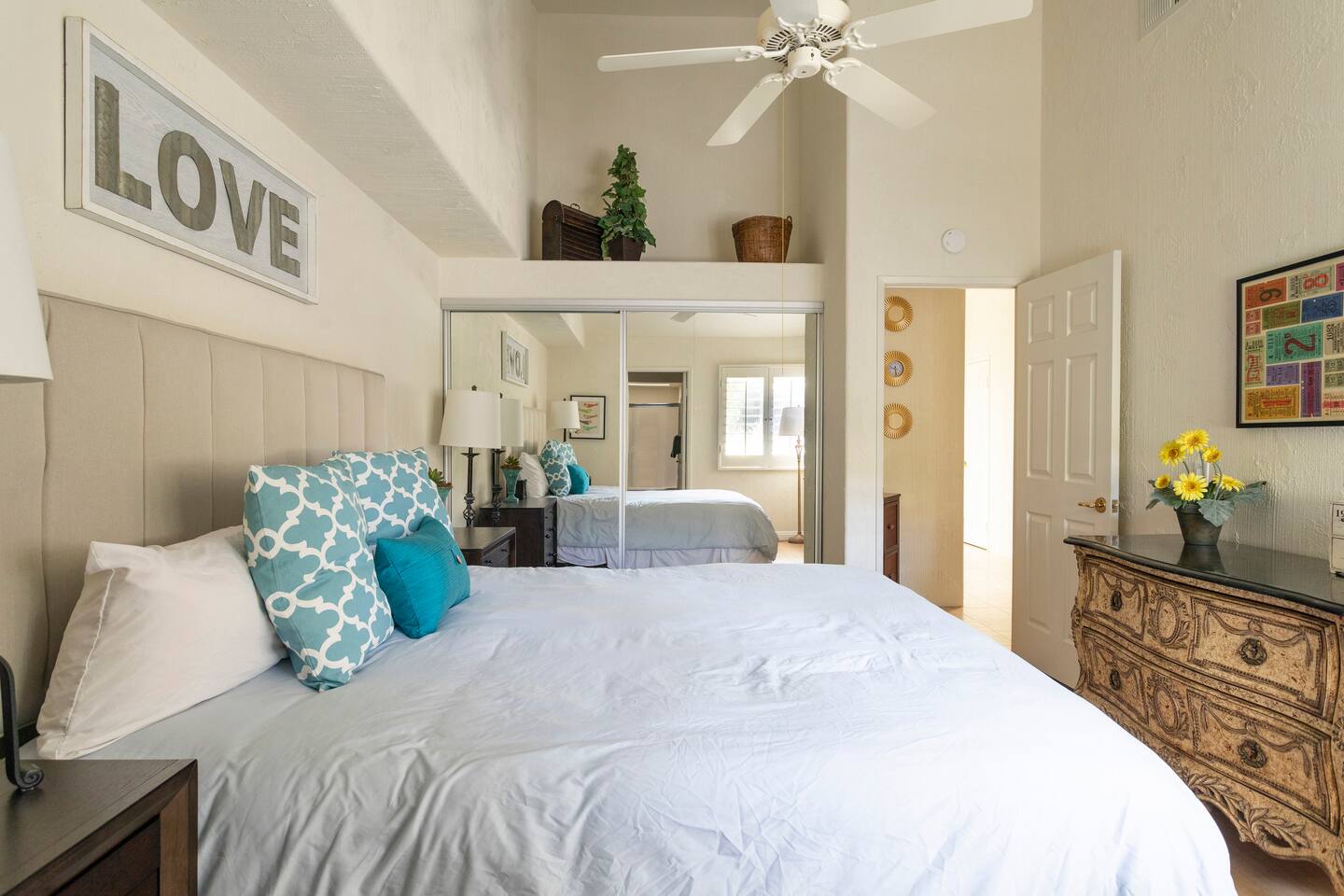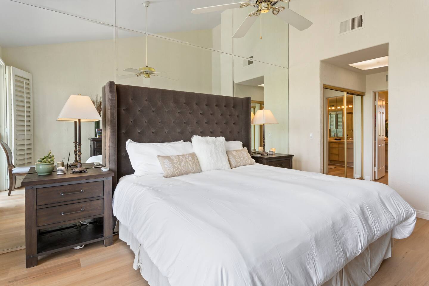 The home is a single-story condo with a welcoming living and dining room concept. There are no upstairs or downstairs neighbors, and no stairs to access the home. There are 3 bedrooms and 3 bathrooms, and all the bedrooms feel private as they are all on separate ends of the home. The master bedroom faces the golf course and has a sliding glass door that leads you out to the backyard with a stunning view. There is a king-size bed and an ensuite bathroom attached. There is a bathtub and a shower, dual vanity sinks, and a vanity station. The second bedroom is close to the front door of the home and has a queen-size bed and an ensuite bathroom attached. There is a bathtub and a shower, a sink, and a vanity station. The third bedroom is close to the front door and just across the hall from the second bedroom and has a queen-size bed and a shared jack-n-jill bathroom attached. There is a standing shower, sink, and a first aid kit, and miscellaneous supplies available in the armoire if needed. This bathroom can be accessed from the hallway with other guests. The master bedroom, second bedroom and living room have TV's. All have Roku/ Smart TV and only the living room has cable. The newly updated kitchen looks out at the dining room and the view of the beautiful golf course. The living room has an open floor plan where you can enjoy the comfy couches and watch a movie on the 62-inch television. There is a Bose soundbar below the television where you can hook up your smart device to it and enjoy some music, just be mindful of the noise and of the neighbors whenever playing music. Music is not allowed to be played outdoors at any time as hefty fines can be assessed. The bookshelf has books for you to enjoy. The dining room table can seat 4 guests comfortably, and there is a small private dining table in the kitchen area as well. There is a bar in the living room that faces the backyard There is a gas BBQ near the entrance of the home in a private courtyard as well as outdoor seating. There is a sliding glass door from the living room as well as the master bedroom that leads you to the backyard that faces the golf course. There are 2 outdoor lounge chairs as well as a table with 2 chairs for you to be able to enjoy the view. There is a nearby pool and spa that’s within walking distance from the front door. The complex has other pools in it as well that can be accessed. There are a few pool areas that require a key for entry. The home temperature is controlled by a Nest that only the owner can access. Please message the host if you need the temperature changed for any reason.